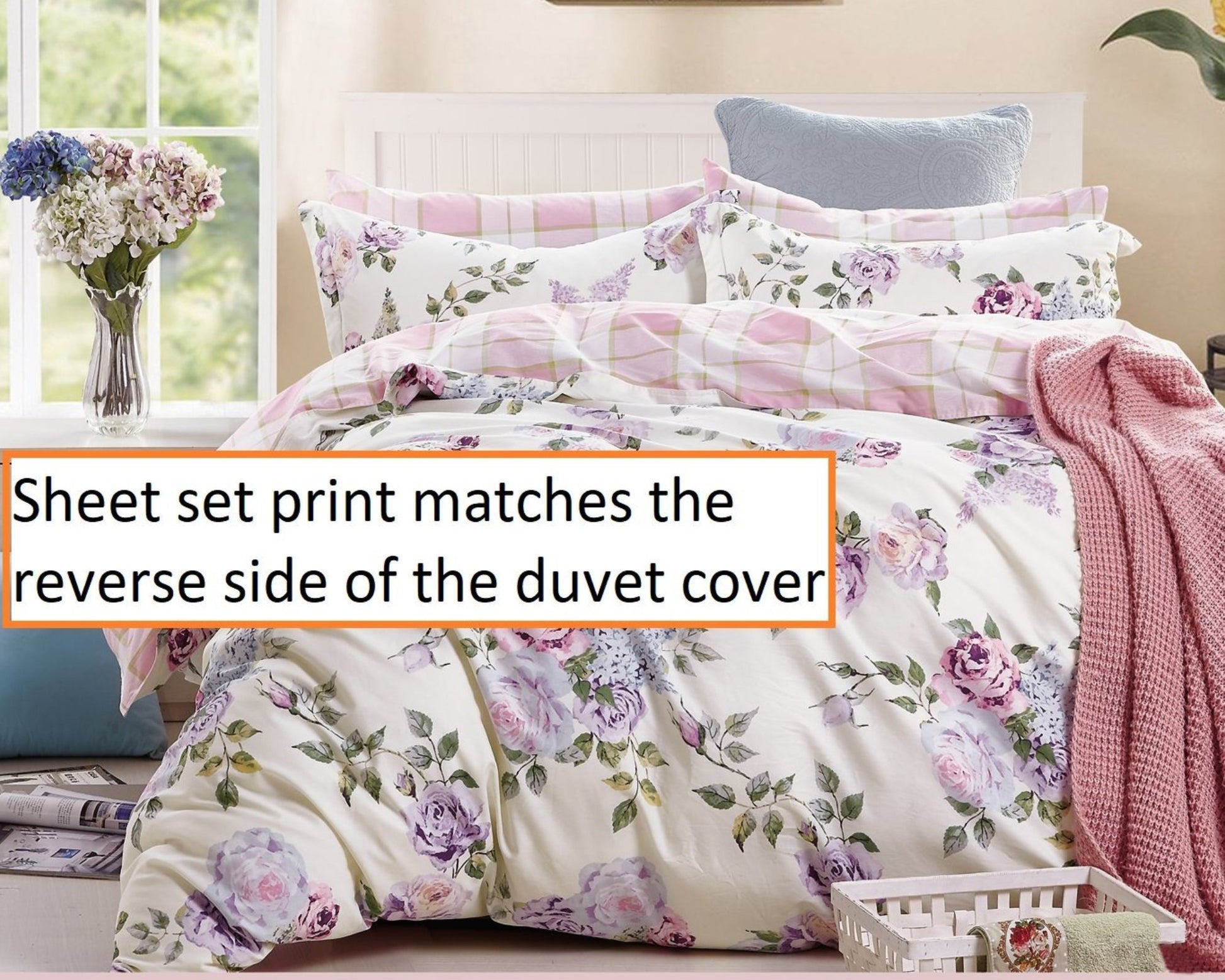 Pink Purple Roses 100% Cotton Sheet Set: Fitted Sheet, Flat Sheet and Two Pillowcases